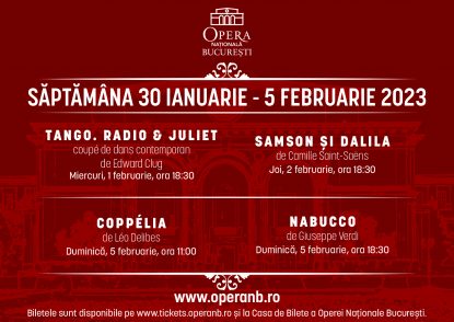Începutul lunii februarie aduce pe scena Operei Naționale București două titluri de operă „Samson și Dalila” de Camille Saint-Saëns și „Nabucco” de Giuseppe Verdi, dar și două titluri de balet „Tango. Radio & Juliet” spectacol coupé de dans contemporan de Edward Clug și „Coppélia” de Léo Delibes.