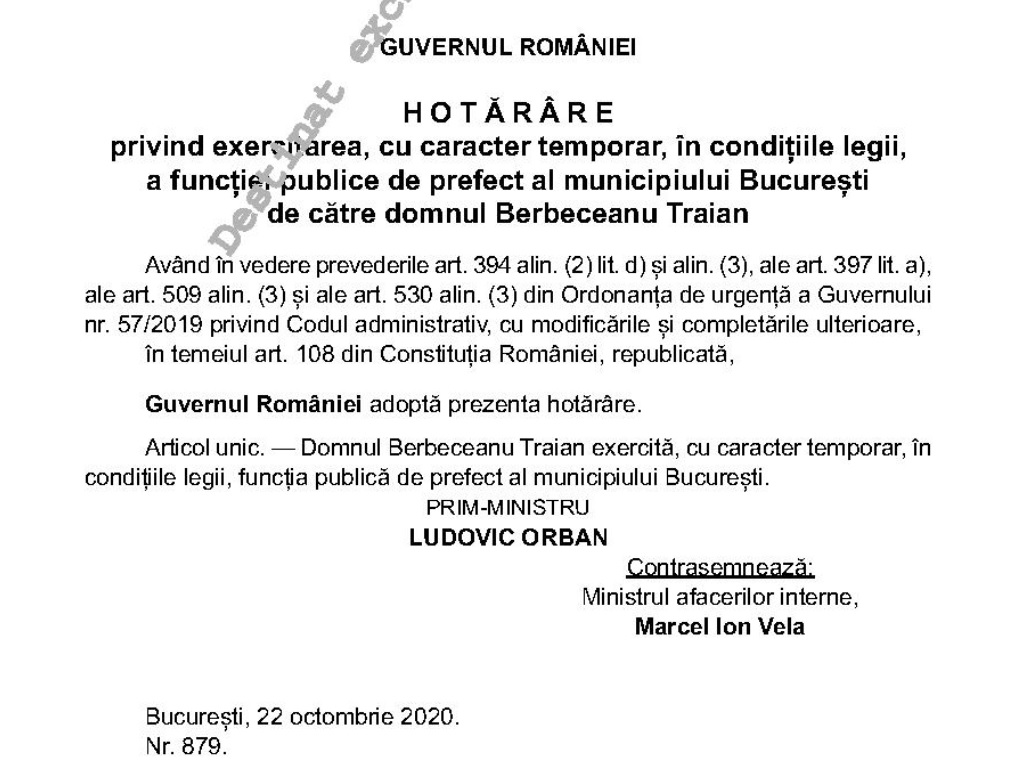 „Domnul Berbeceanu Traian exercită, cu caracter temporar, în condițiile legii, funcția publică de prefect al municipiului București”, se arată în hotărârea de guvern.
