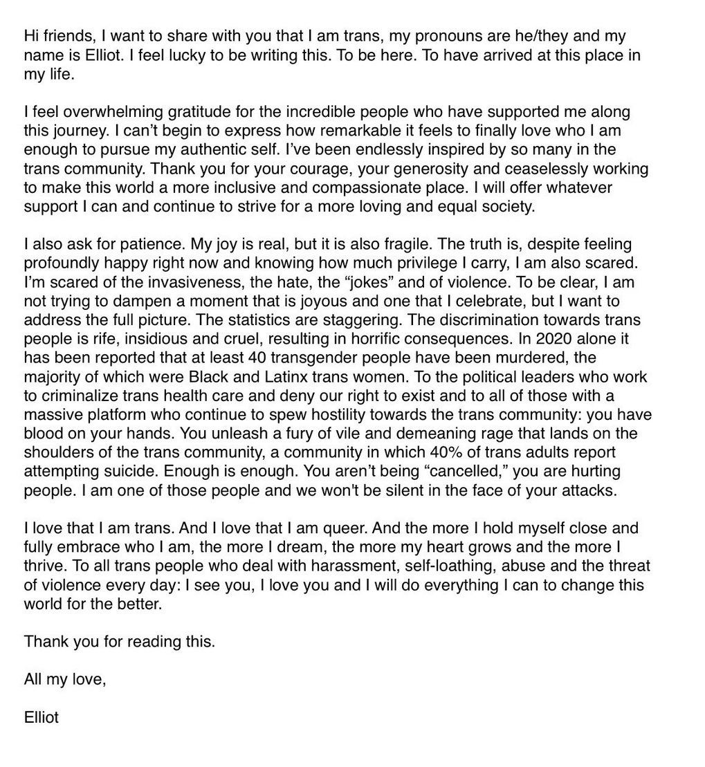 „Vreau să vă împărtăşesc că sunt trans, pronumele mele sunt el/ ei şi numele meu este Elliot”, potrivit unui anunț postat pe Instagram.