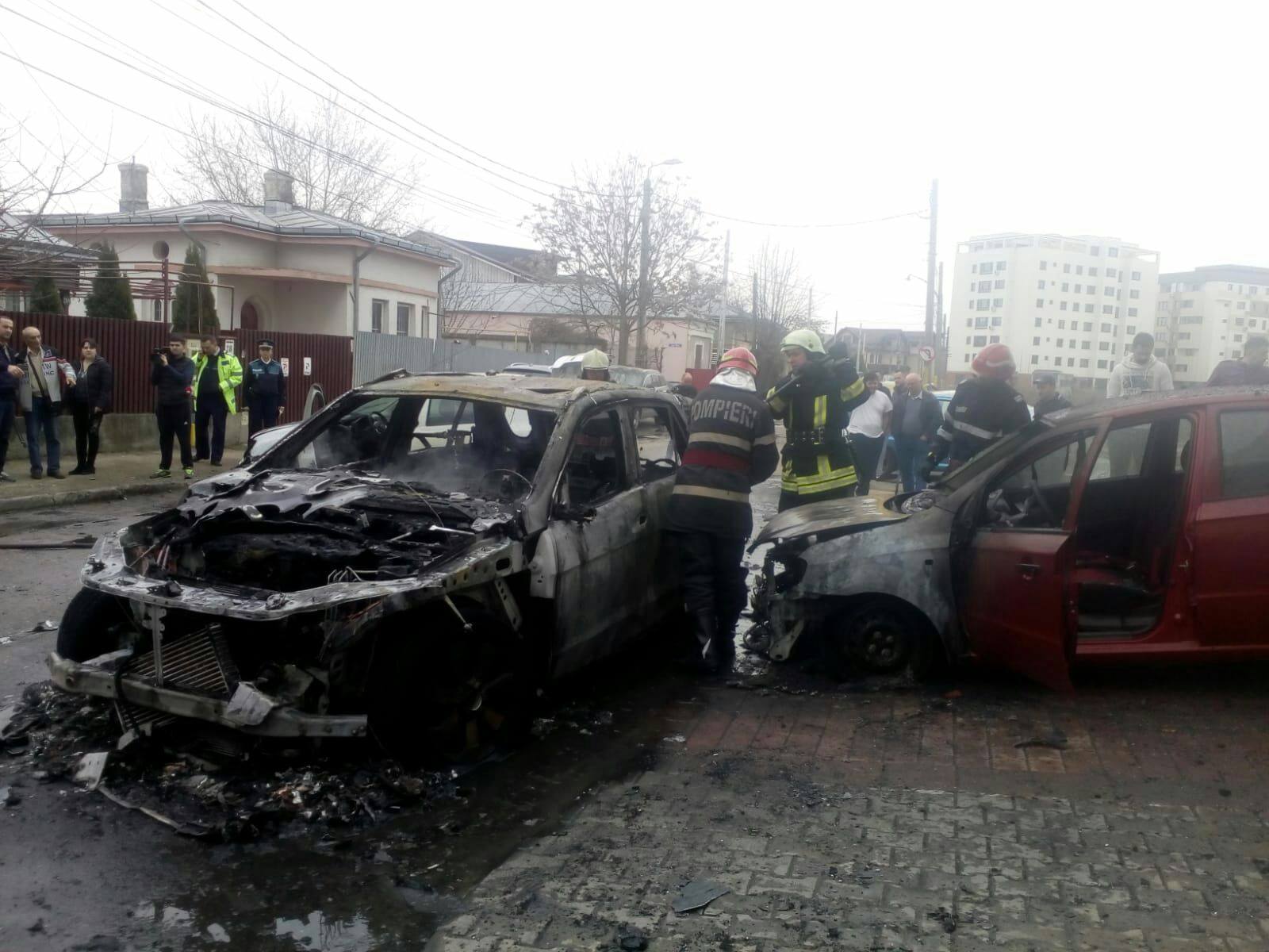 Panică pe bulevardul central din Bacău, unde 3 autoturisme au ars ca o torță.