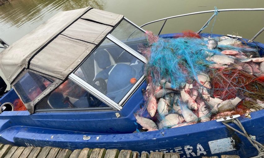 Intr-o acțiune pentru combaterea pescuitului ilegal, polițiștii de frontieră de la Sulina au facut verificari pe mai multe intinderi de apă. Pe lacul Razim, au descoperit mai multe plase cu captură de pește în ele. S-a constatat că lungimea totală a plaselor din mono-filament este de 900 metri și cantitatea de pește este de 225 kg, diferite specii.