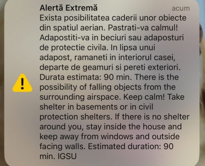 Mesajul a fost transmis în jurul orei 3.00 dimineața. Oamenii au fost avertizați că din spațiul aerian ar putea cădea resturi de drone și au fost sfătuiți să se adăpostească.