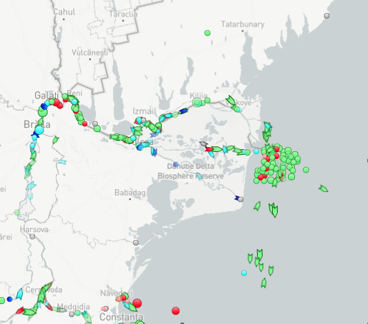 În schimb, traficul maritim este intens în apropiere de portul românesc Sulina, ceea ce înseamnă că brațele Sulina și Chilia vor prelua o parte din traficul de cereale din Ucraina, în acest nou sezon de recoltare.