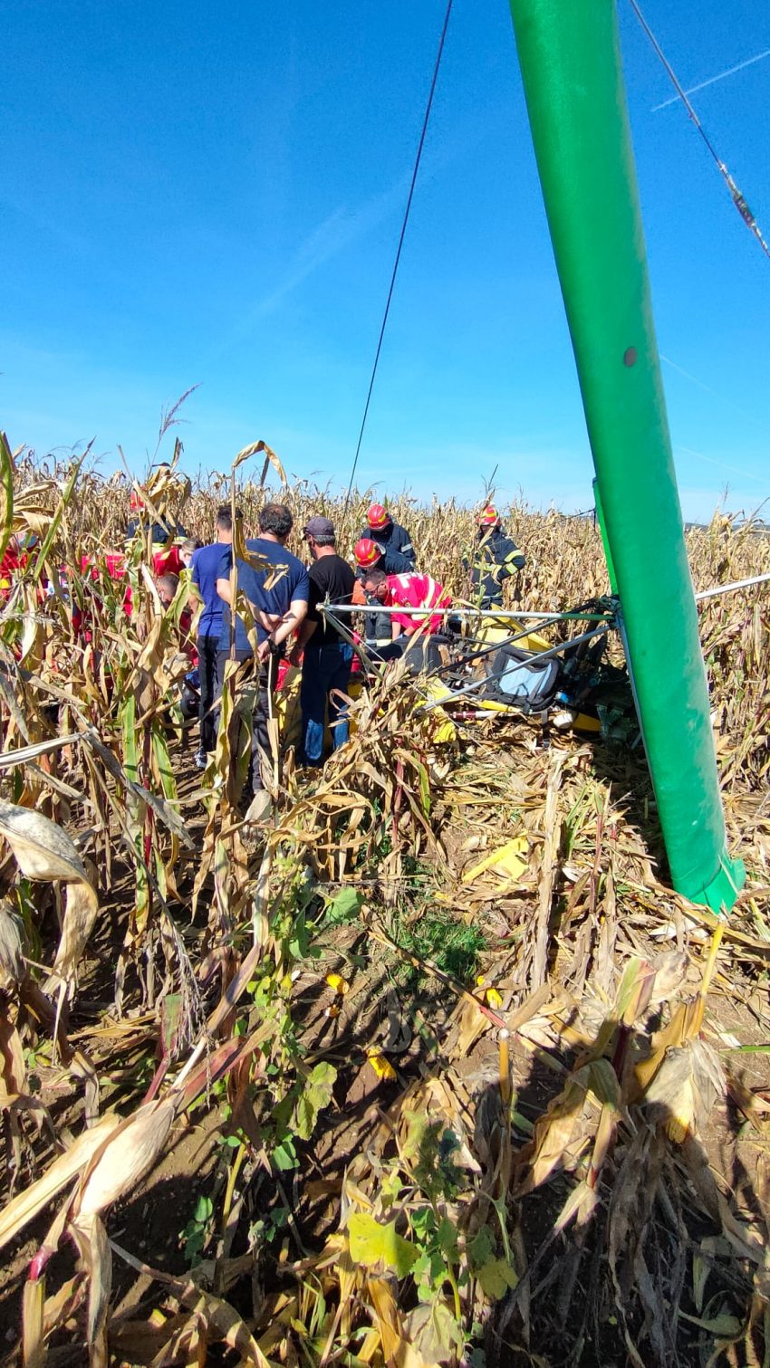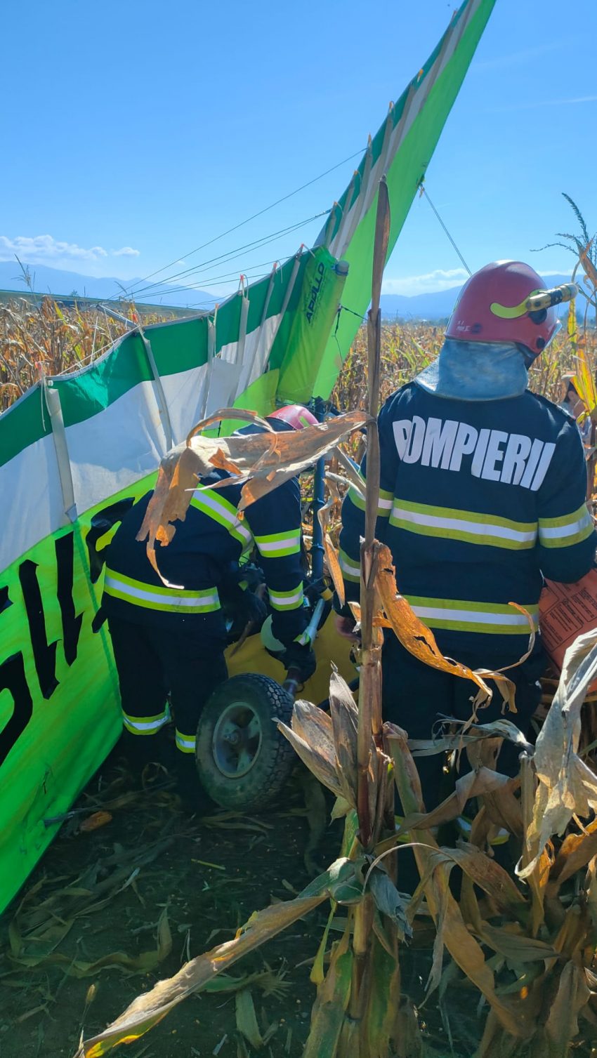 Echipajele ISU Sibiu intervin cu două ambulanțe SMURD (dintre care una cu medic) și o autospecială de stingere, la ieșirea din localitatea Șelimbăr spre Bungard, unde un motodeltaplan s-a prăbușit.