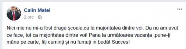 Într-o postare pe contul sau de Facebook, deputatul PSD de Maramureş, Călin Matei, le transmite elevilor că nici lui nu i-a fost dragă şcoala, dar că nu a avut ce face… şi îi îndeamnă: