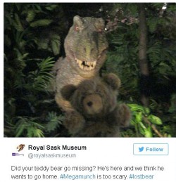 Doar că un angajat al Royal Sask Museum îşi aminteşte că l-a întâlnit pe copil plângând, speriat probabil de un schelet de dinozaur, şi l-a liniştit, dându-i asigurarea că ursuleţul îl păzeşte de orice necaz.