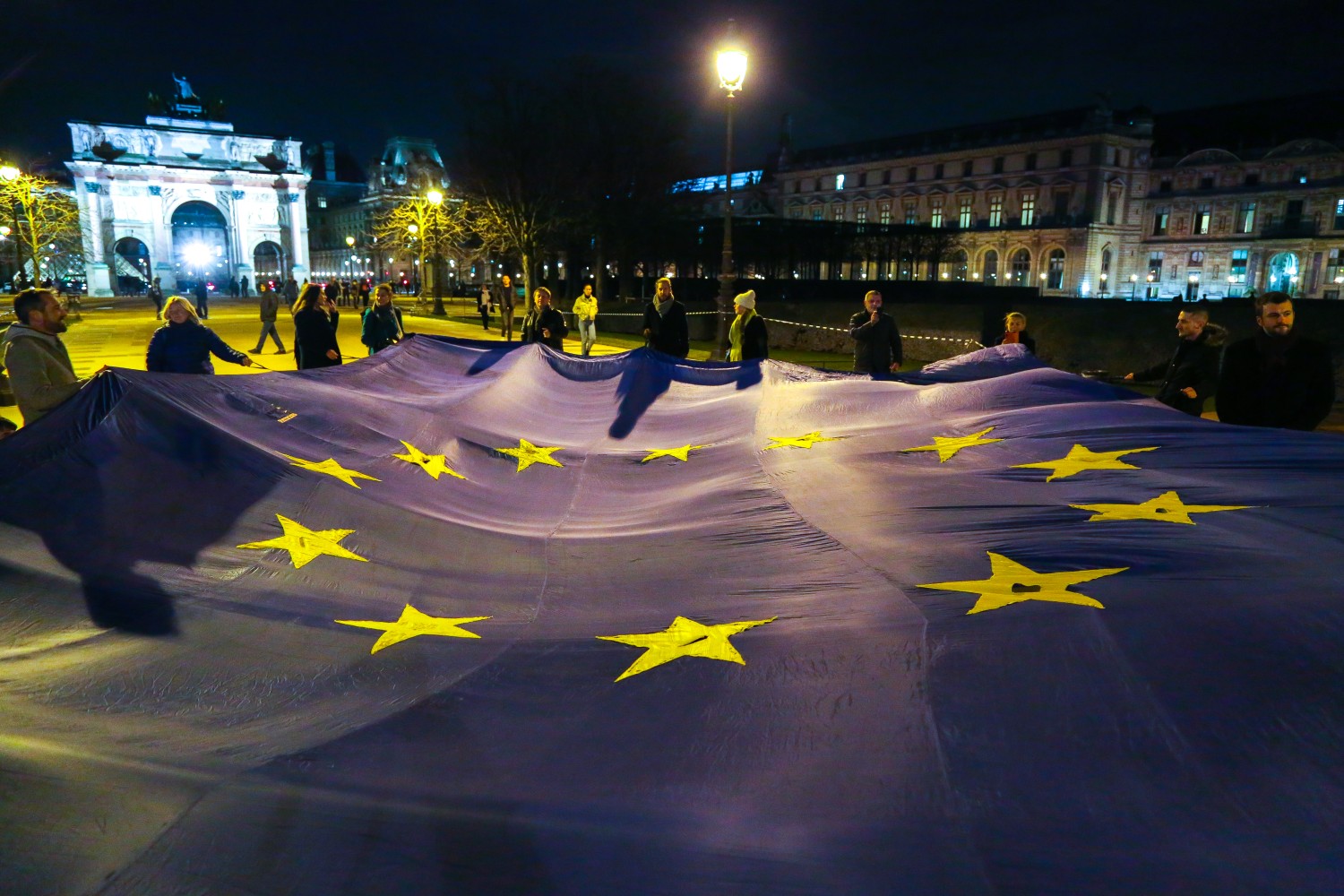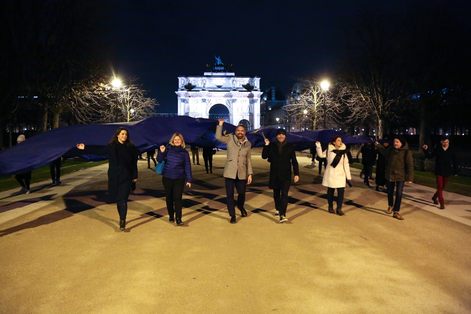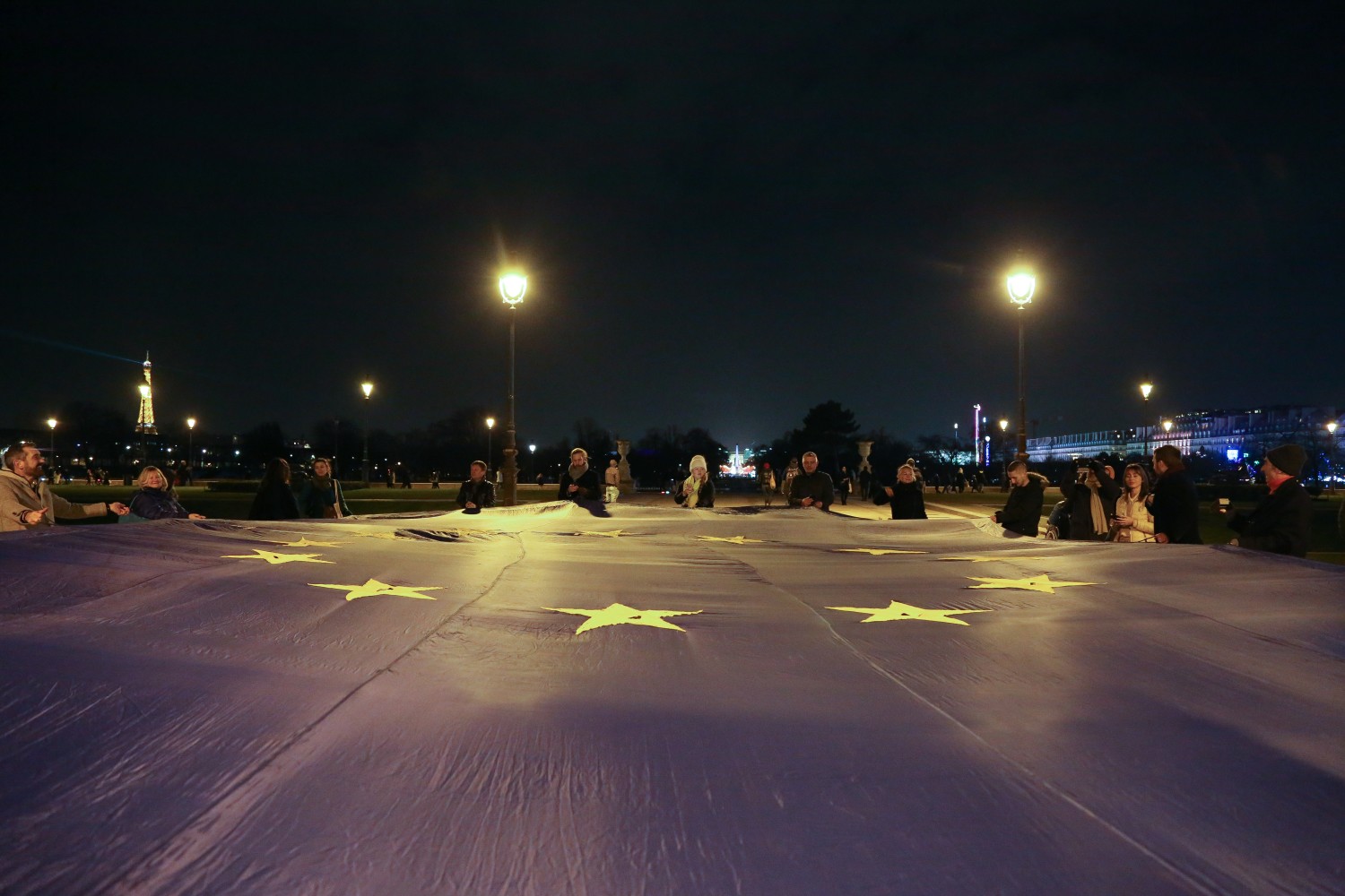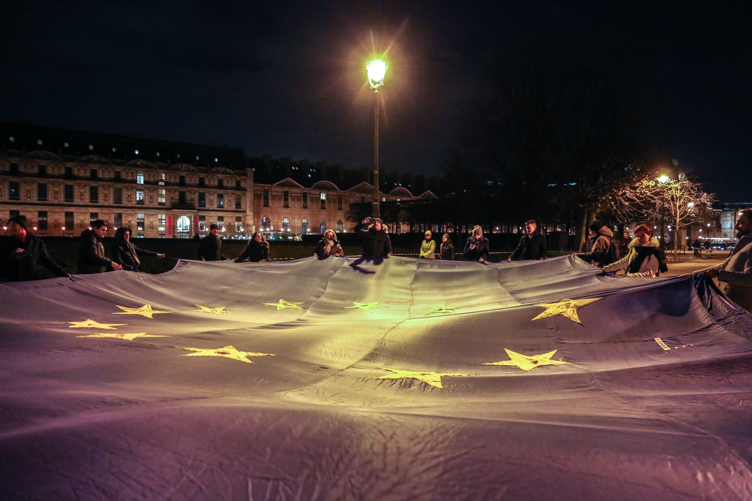 După un lung parcurs prin aproape toata Europa, steagul Uniunii Europene, cusut de mână în România, a fost purtat, vineri seara, lângă Luvru, pe brațe de cetățeni europeni de diverse naționalități, ca un simbol al dorinței comune de a constitui o Europă unită. Evenimentul a fost anunțat prin intermediul Facebook și a fost organizat inițiativa PLUS Franța și a altor partide aliate Renew Europe prezente în Franța.