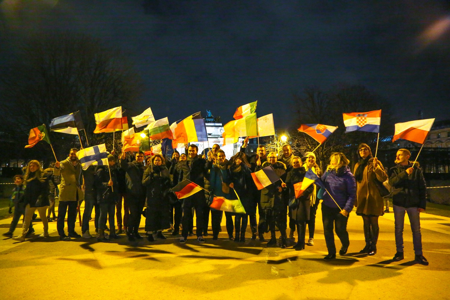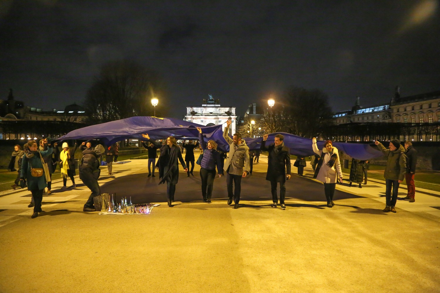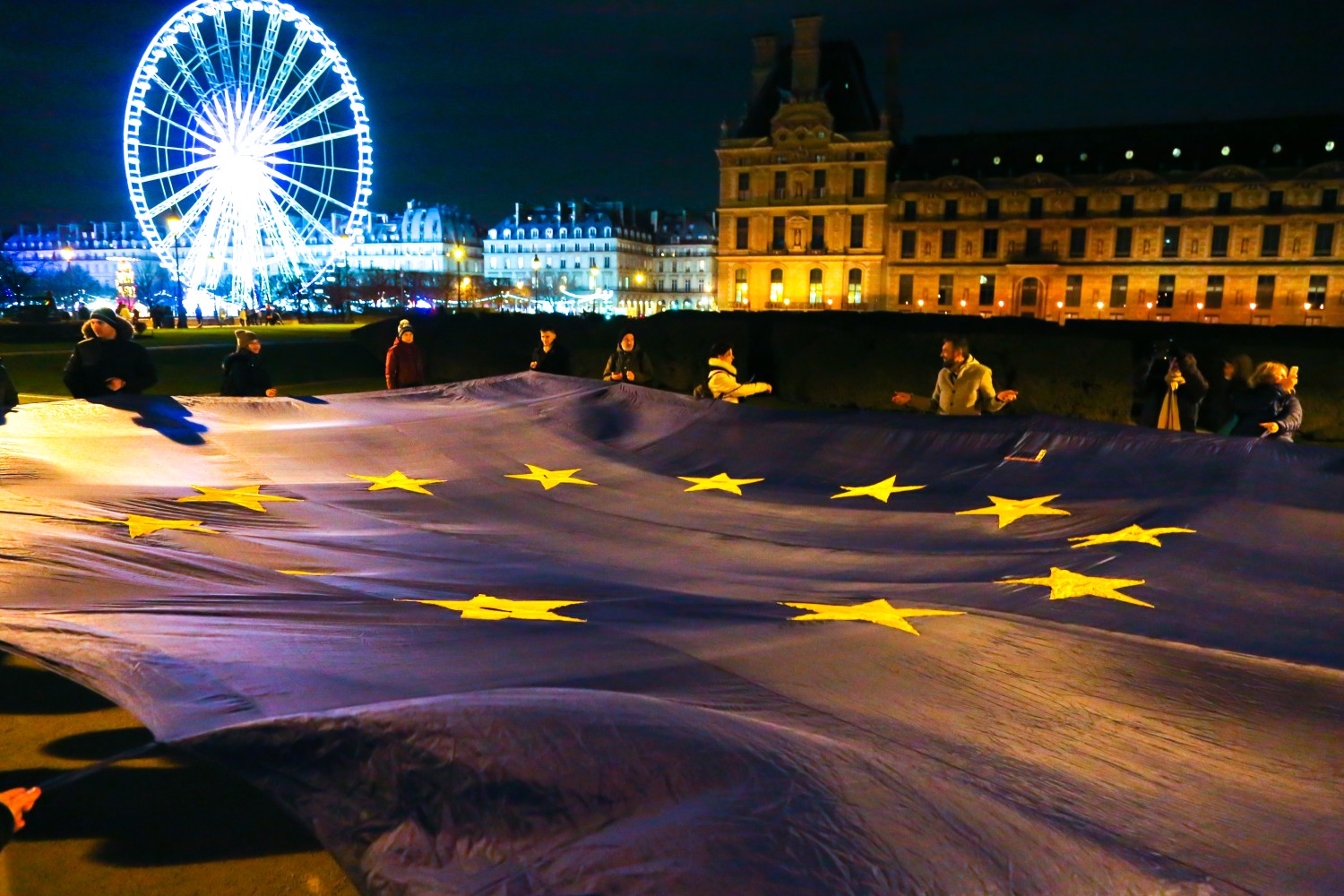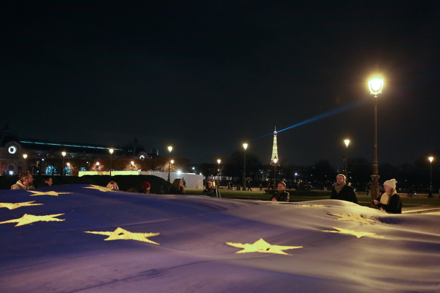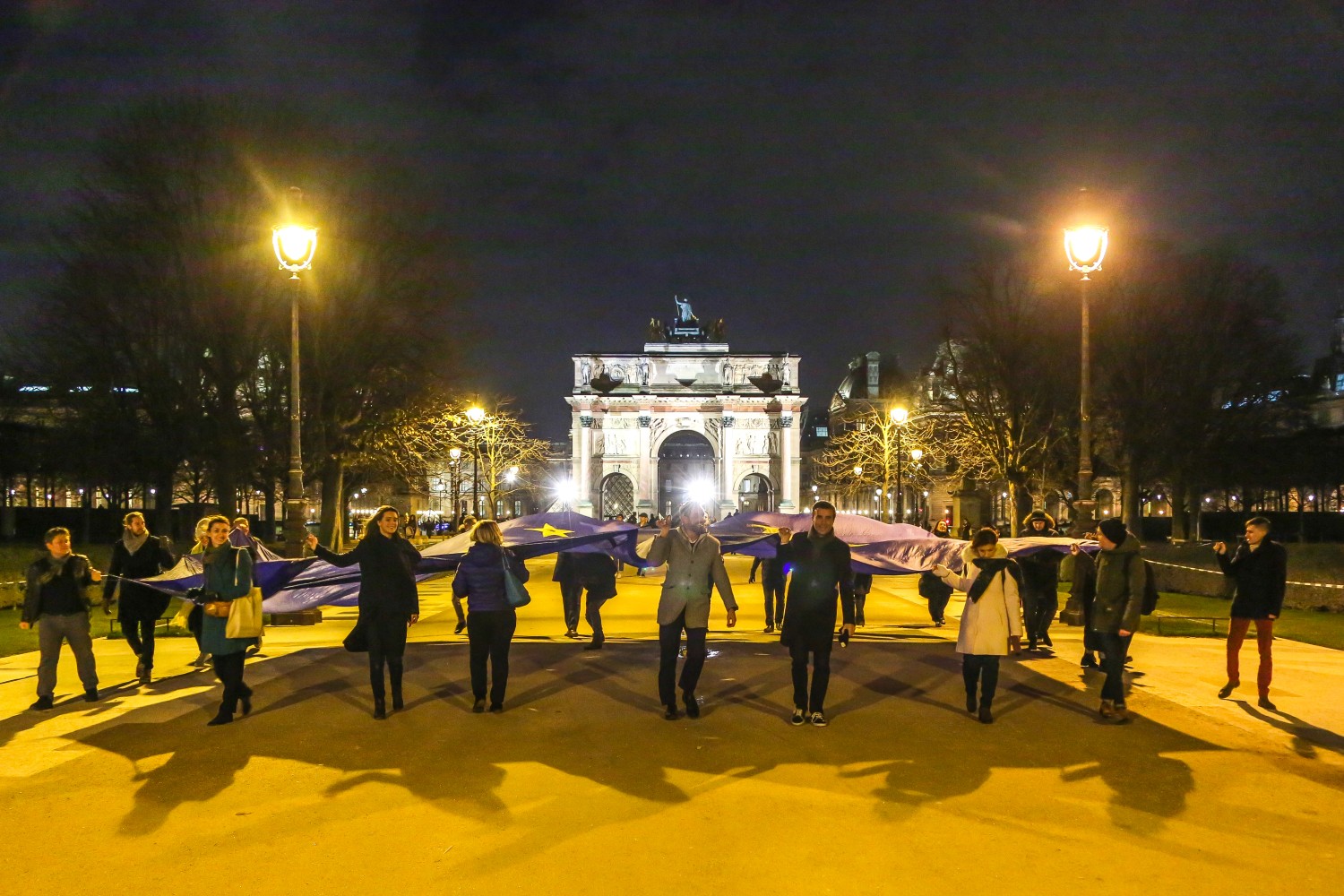 După un lung parcurs prin aproape toata Europa, steagul Uniunii Europene, cusut de mână în România, a fost purtat, vineri seara, lângă Luvru, pe brațe de cetățeni europeni de diverse naționalități, ca un simbol al dorinței comune de a constitui o Europă unită. Evenimentul a fost anunțat prin intermediul Facebook și a fost organizat inițiativa PLUS Franța și a altor partide aliate Renew Europe prezente în Franța.