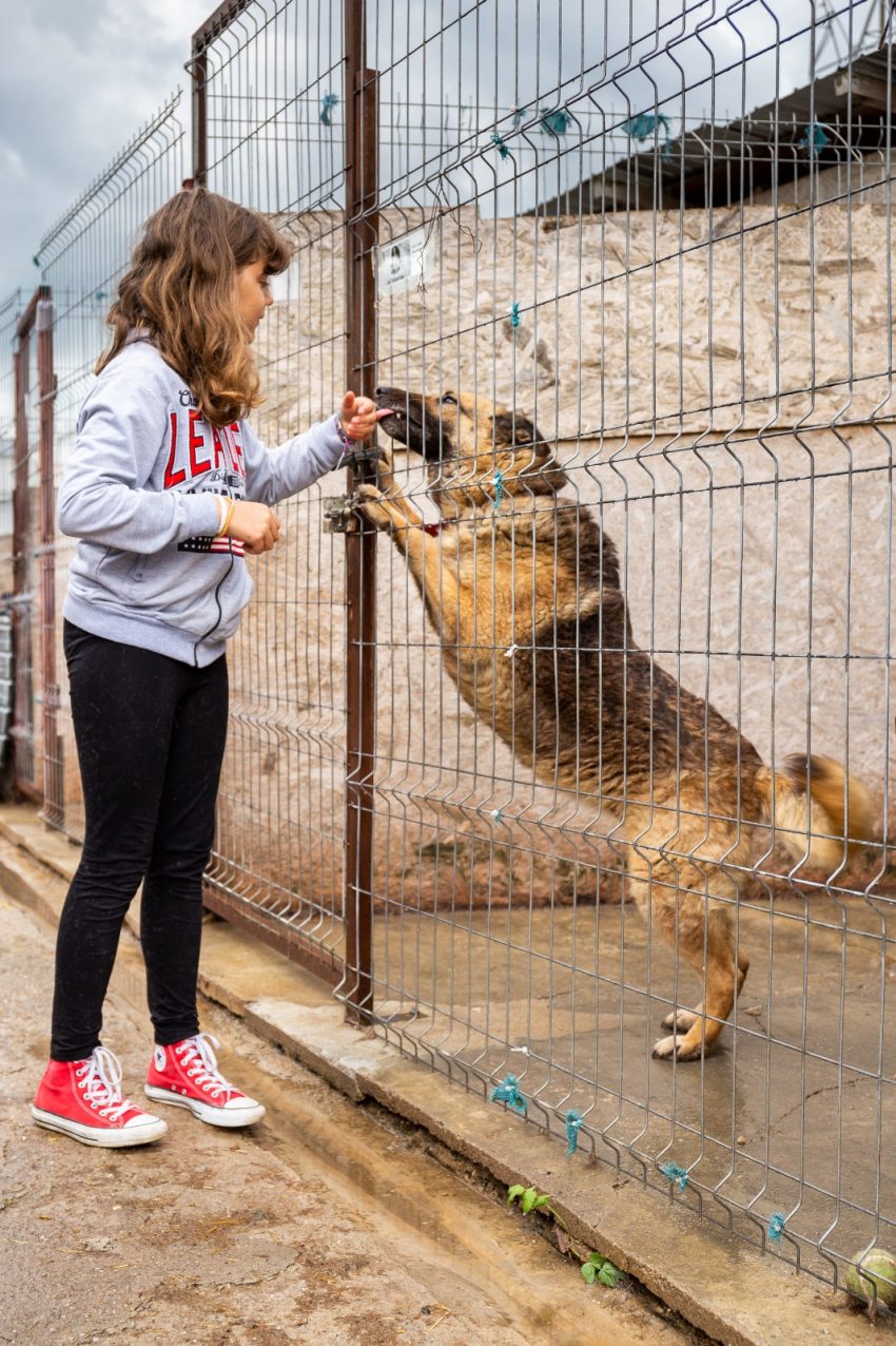 “- Uite, dintr-un container am făcut așa pentru iarnă, mai ales. Câinii cei mai bătrâni sau mai bolnavi îi băgăm aici. Avem calorifere, să le țină de cald. Iar ea este o cățelusă de pe câmp. E gestantă și e într-o fază târzie. Ce faci, iubita mea? – Mă chemi când face puiuții? – Da, sigur! – Pot s-o mângâi? – Da, sigur! Ea e un pic speriată, dar e foarte cuminte și bună. – I-ați dat un nume? – Sara! Mergem pe adopții de la distanță. Îl prezint pe pagina mea de Facebook și… – Ai vaccinat-o? – Nu, pentru că este gestantă. Și un om care o place, dar nu poate să o ia acasă din motive de timp, să zicem, poate să doneze 100 de lei pe lună pentru ea sau pentru alt cățel. E insuficient, pentru că un câine poate să se îmbolnăvească, trebuiesc vaccinuri, cip-uri, sunt o grămadă de lucruri care trebuiesc pentru un câine abia intrat în adăpost. Dar asta ne ajută să îl susținem în continuare.”, spune Maya.