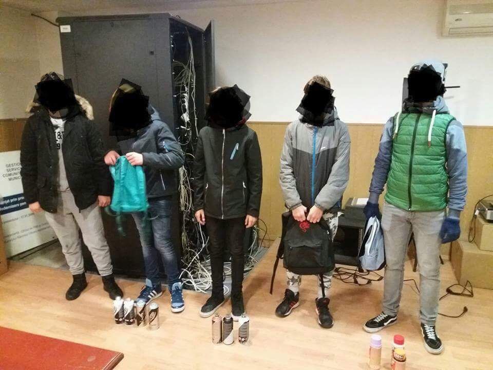 Este vorba de cinci minori cu vârste cuprinse între 14 şi 15 ani asupra cărora poliţiltii au găsit 10 spray-uri cu vopsea de diferite culori.