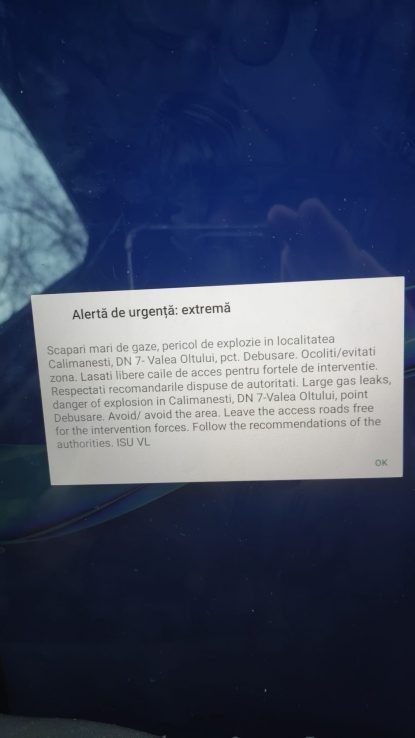 Pericol de explozie pe raza localității Călimănești, județul Vâlcea. Au fost sesizate scăpări de gaze dintr-o autocisternă. La fața locului se află echipaje de pompieri, iar populația a primit mesaj de tip Ro-Alert.