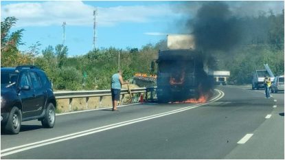 Tir în flăcări pe Dealul Negru – DN7 – Milcoiu, în județul Vâlcea. Șoferul s-a autoevacuat, nu a suferit arsuri.