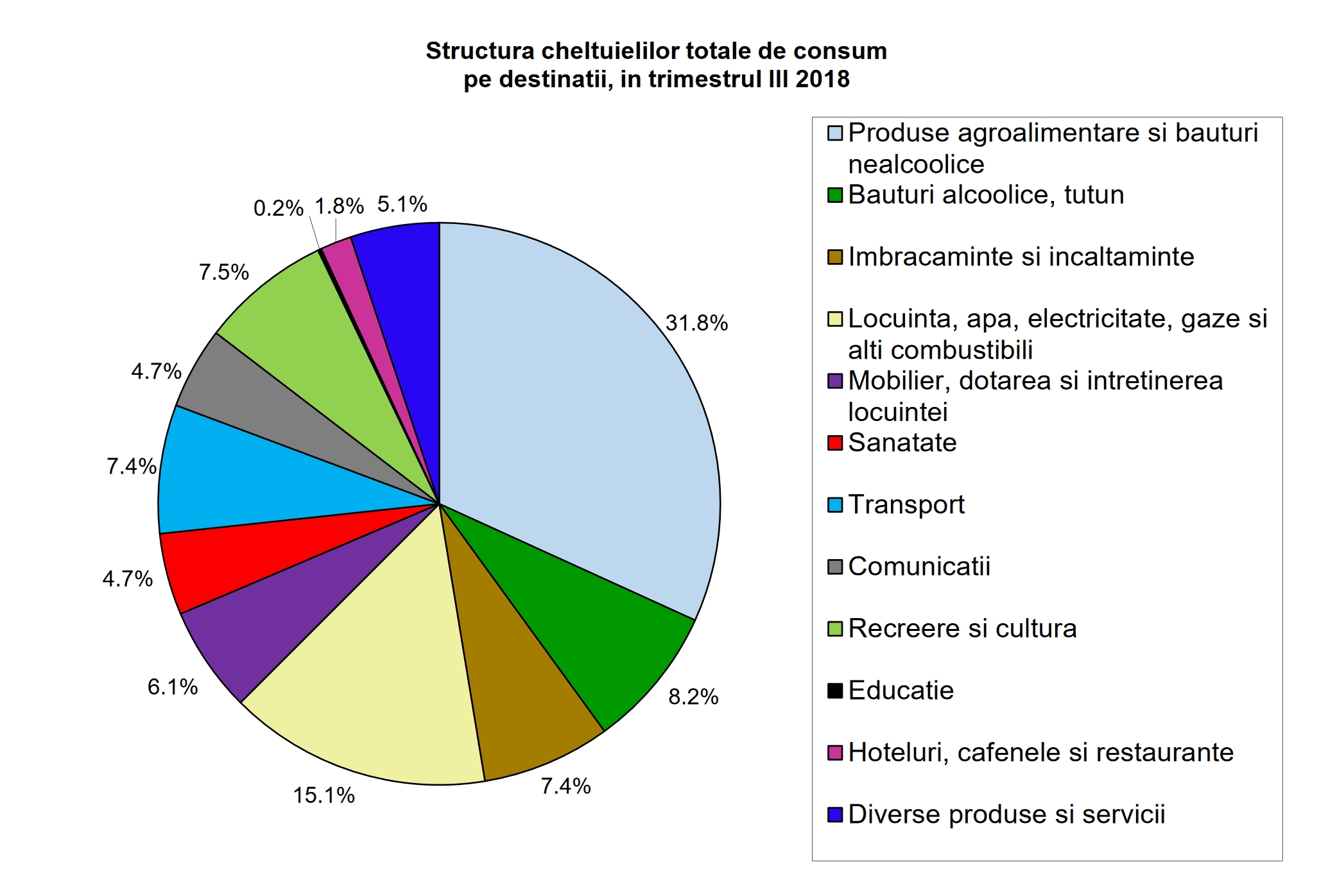 Conform clasificării standard pe destinaţii a cheltuielilor de consum (COICOP), produsele alimentare şi băuturile nealcoolice au deţinut, în trimestrul III 2018, în medie,31,8 % din consumul gospodăriilor.