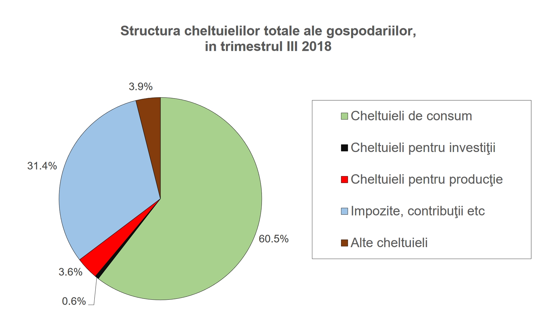 Cheltuielile totale ale populaţiei, au fost, în trimestrul III 2018, în medie, de 3.891 lei lunar pe gospodărie (1497 lei pe persoană) şi au reprezentat 87,4 % din nivelul veniturilor totale.
