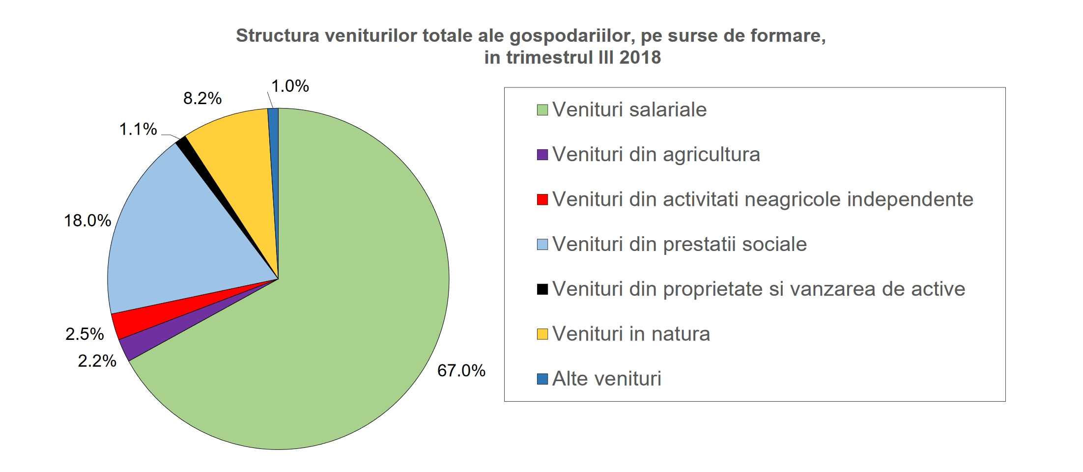 La formarea veniturilor totale ale gospodăriilor, au contribuit, de asemenea, veniturile din prestaţii sociale (18%), veniturile din agricultură (2,2%), veniturile din activităţi neagricole independente (2,5%), cele din proprietate şi vânzărea de active din patrimoniul gospodăriei (1,1%) precum şi veniturile în natură (8,2%), în principal, contravaloarea consumului de produse agroalimentare din resurse proprii (6,8%).