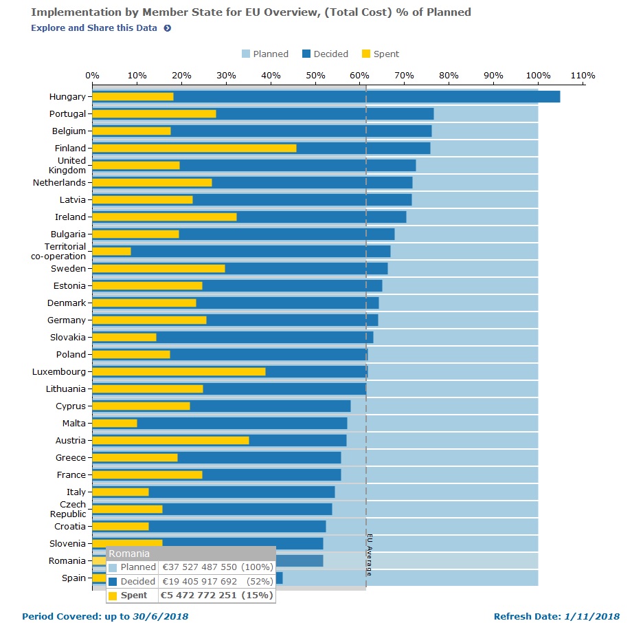 Implementarea proiectelor europene în Statele Membre la 1 noiembrie 2018. Sursa: Comisia Europeană