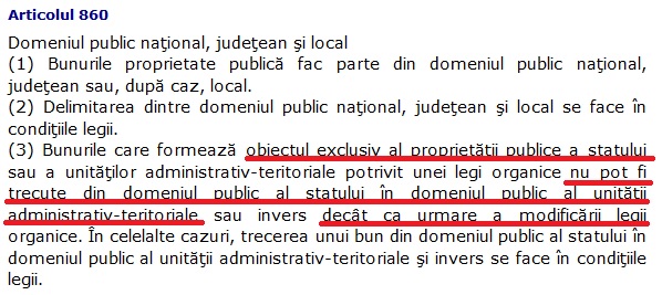 2010 este însă momentul-cheie în care Parlamentul schimbă Codul Civil. Ceea ce a devenit proprietatea statului prin lege nu poate fi transferat la nivel local decât tot prin lege (v. Art 860 alin (3) din Noul Cod Civil). Este cazul plajelor, ca și al apelor care pot fi valorificate pentru energie. Apele au intrat în patrimoniul Administrației Naționale „Apele Române”, în 2002, prin OUG 107.
