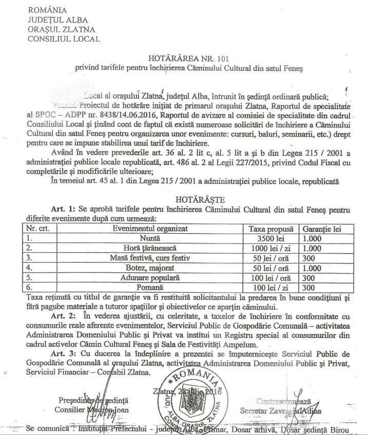 Am găsit-o într-un oraș din Apuseni. La Zlatna, în județul Alba, Consiliul Local a hotărât în 2011 să pună 8 taxe, așa cum îi permite legea în virtutea autonomiei locale.