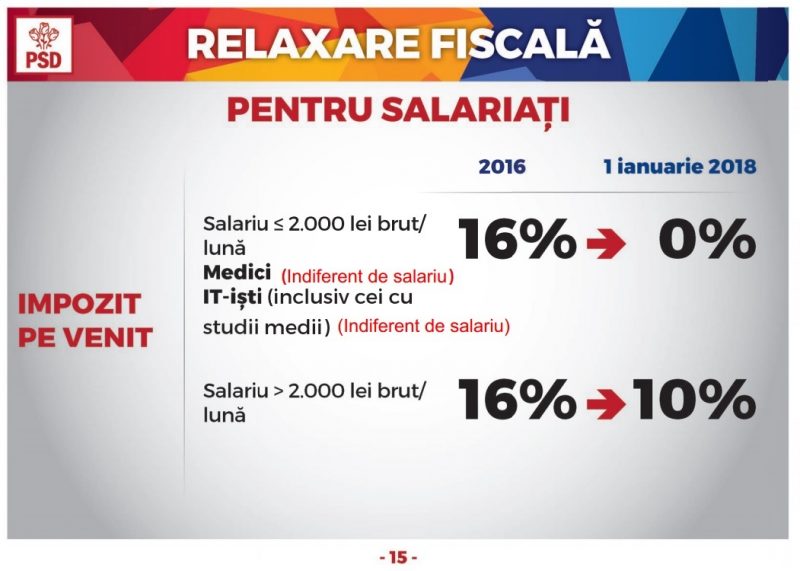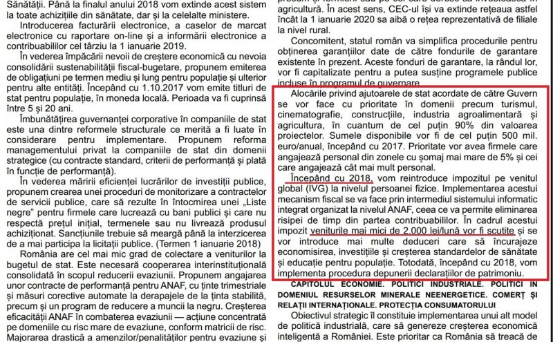 „Începând cu 2018, vom reintroduce impozitul pe venitul global la nivelul persoanei fizice. Implementarea acestui mecanism fiscal se va face prin intermediul sistemului informatic integrat organizat la nivelul ANAF, ceea ce va permite eliminarea risipei de timp din partea contribuabililor. În cadrul acestui impozit, veniturile mai mici de 2.000 de lei pe lună vor fi SCUTITE și se vor introduce mai multe deduceri care să încurajeze economisirea, investițiile și standardele de sănătate și educație pentru populație.”