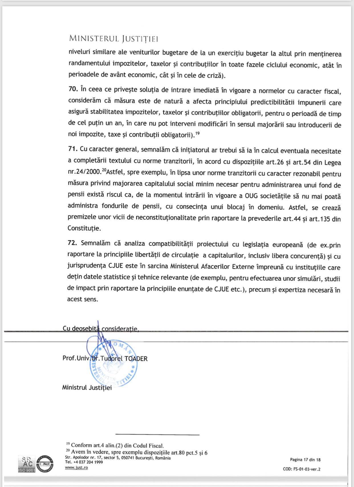 „Ministerul Justiției a formulat 72 de observații la Ordonanța «Valcov – Teodorovici» ! 72! Consiliul Economic și Social (patronate, sindicate și ONG-uri) au dat în unanimitate aviz negativ!