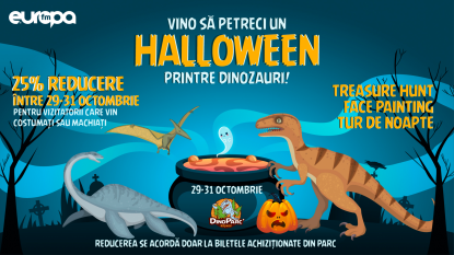 Vizitatorii care vor veni la Dino Parc Râșnov costumați sau machiați în personajele lor favorite în perioada 29 – 31 octombrie, vor primi 25% reducere la biletele de intrare achiziționate direct din parc.