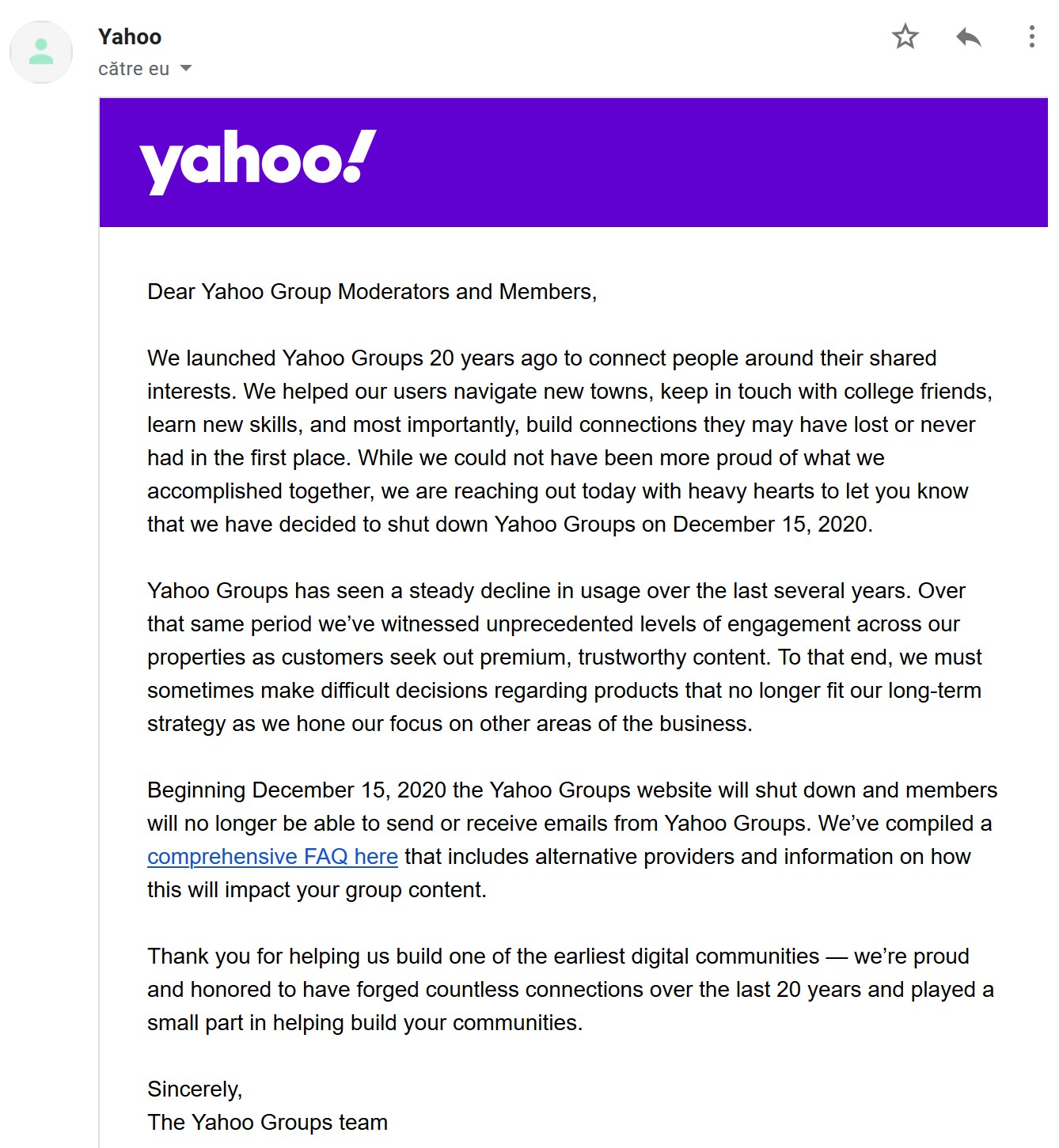 Am decis să închidem Yahoo Groups pe 15 decembrie 2020. Yahoo Groups a înregistrat un declin continuu în ceea ce priveşte utilizarea în ultimii câţiva ani”, se arată în mesajul trimis săptămâna aceasta utilizatorilor Yahoo.
