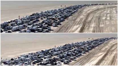 Imaginile publicate de CNN arată cozi de kilometri, pe zece benzi, prin deșert. Poliția avertizează că sunt porțiuni întregi pline de noroi care fac înaintarea mașinilor dificilă și le-a cerut spectatorilor să amâne plecarea pentru a nu crea blocaje rutiere.