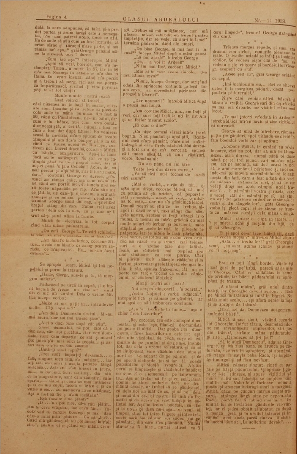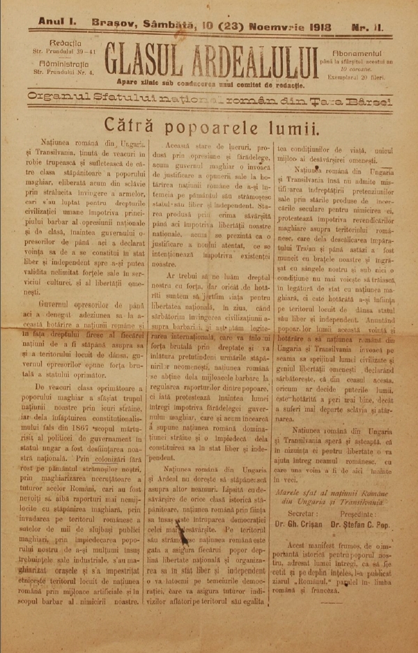 Primul număr din Glasul Ardealului, din Braşov, apare la 9 noiembrie 1918. Ziarul era organul oficial de presă al Sfatului Național Român din Țara Bârsei.