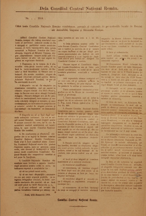 La 18 noiembrie 1918, Consiliul Național Român Central redactează Manifestul “Către popoarele lumii”, în care se dezvăluia opresiunea exercitată de clasa stăpânitoare maghiară şi refuzul Ungariei de a recunoaşte dreptul românilor la autodeterminare.