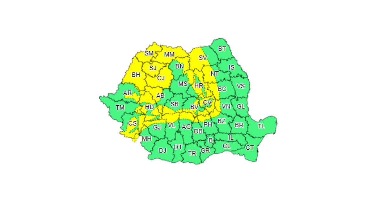 Judeţele vizate de atenţionările Cod galben sunt Alba, Argeş, Arad, Bacău, Bihor, Bistriţa-Năsăud, Braşov, Buzău, Cluj, Caraş-Severin, Covasna, Dâmboviţa, Gorj, Hunedoara, Harghita, Mehedinţi, Maramureş, Mureş, Neamţ, Prahova, Sibiu, Sălaj, Satu Mare, Suceava, Timiş, Vâlcea şi Vrancea.